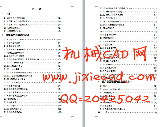 This project is about the application of the CAD/CAM technique in the wrought mould surface processing . It contains two parts : one is about the mould design of the motorcycle jacket and the other is about the numerical control simulate process of the mould surface . Under the environment of Mastercam 8.0 , I will sculpt the mould of the motorcycle jacket using the CAD function , and then , I will weave the tool route , simulate processing and create the NC programme via the back disposing using the CAM function . And at last , I hope I can improve my cognition to the significance of the CAD/CAM technique’ application in the mould industry by the study of the task .