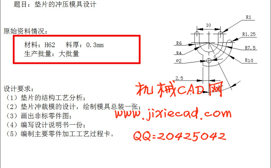 垫板——冲孔落料级进模设计。通过分析制件的工艺性可确定制件的成形加工需要一副模具完成。在一副连续模中,可以完成包括冲裁,弯曲,拉伸和成形等多道冲压工序。相对其他冷冲压模具结构而言,它具有以下一些优点:①工件加工精度较好,尺寸精度较高,并且模具寿命较长; ②生产效率高,凸凹模不受到最小壁厚的限制。但需考虑的问题是:模具零部件加工制造比较困难,成本较高,并且受条料外形尺寸的精度限制较大。