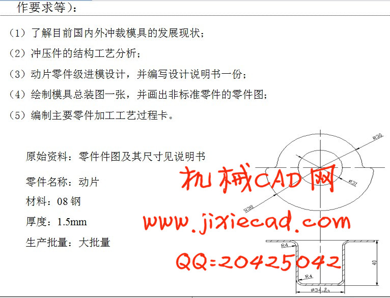 摘要:本设计为动片落料拉伸级进模设计。通过对该零件模具的设计,进一步加强了设计者冲压模设计的基础知识,为设计更复杂的冲压模具做好了铺垫和吸取了更深刻的经验。