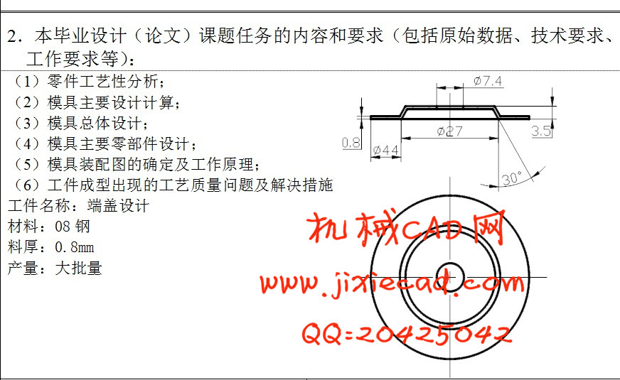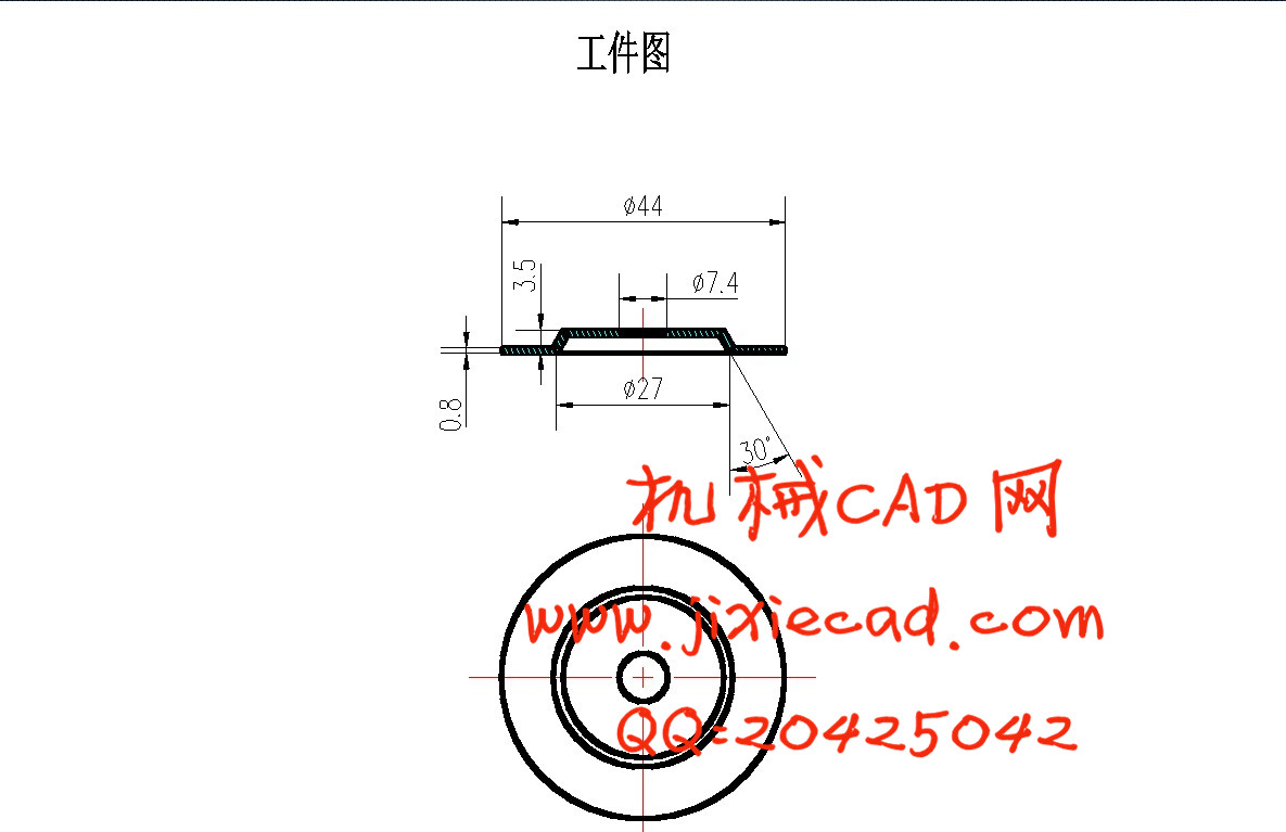 设计着重介绍了制件的成型工艺,及模具结构设计。通过对制件的工艺分析,确定了工艺方案。并设计了一套正装复合模具。在设计同时利用参考资料,确定了各工作零件的尺寸。并较多的考虑了模具结构的调整性、易更换性及模具成本。同时在模具设计内容中融汇了冲压模具的不同加工方法、加工工艺及装配工艺,对初学冲压模具模设计者有一定的参考价值。本设计从模具设计到零部件的加工工艺以及装配工艺等进行详细的阐述,并应用CAD进行各重要零件的设计。