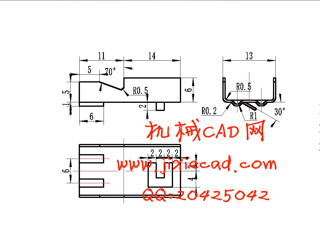 After a detailed analysis and calculation of the final nesting program: the side edge trimming, pierced pilot hole, punch two non-circular hole (waste), red five non-round hole (waste), two non-circular hole punch (waste) , forming the intermediate bent downwardly bent upwardly, and finally cut.