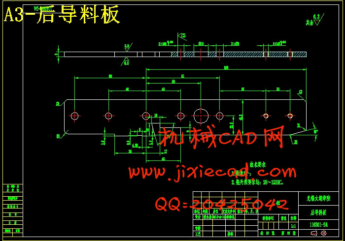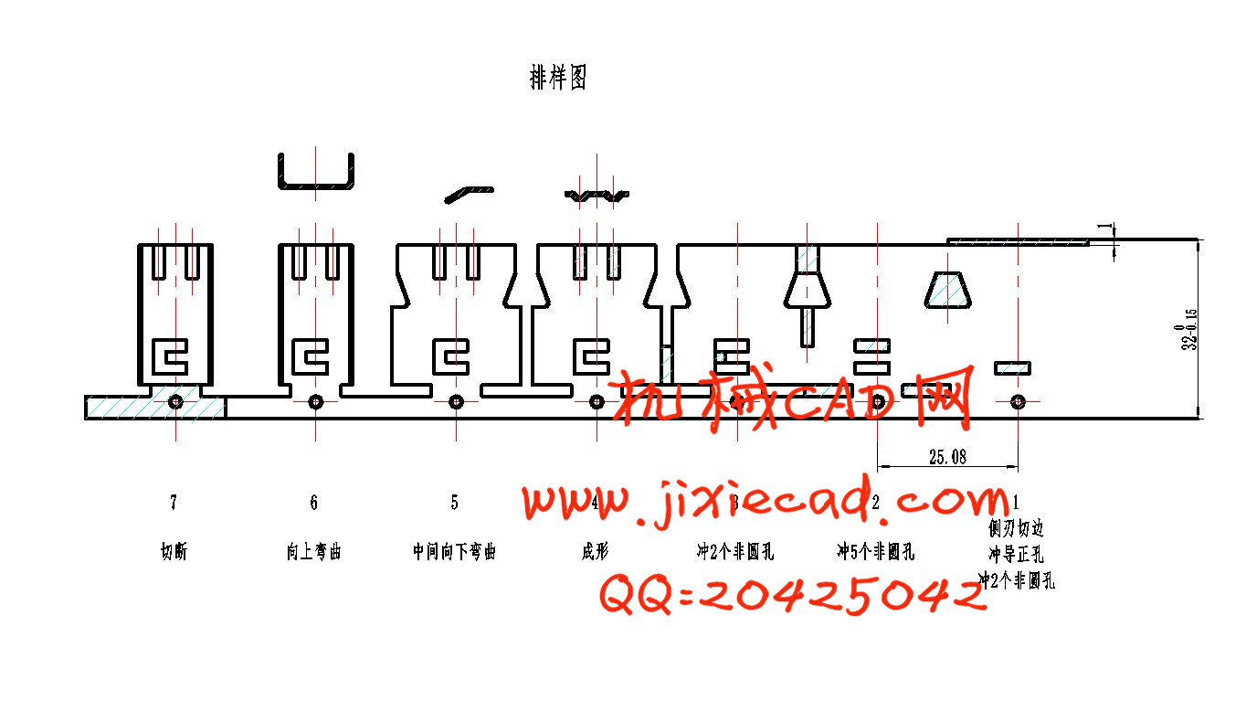 经过详细分析和计算最终排样方案为:侧刃切边,冲导正孔,冲2个非圆孔(废料),冲5个非圆孔(废料),冲2个非圆孔(废料),成形,中间向下弯曲,向上弯曲,最后切断。