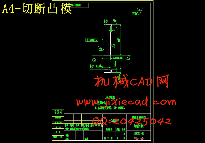 本模具采用切废料方式进行冲裁,故模具结构采用冲孔、导正、弯曲、切断的工序设计,排样采用单排横排排列。并采用正装方式设计模具结构,即凹模装在下模部分,凹模采用浮动方式,并装有内部小导柱。首先为了正确控制送料步距采用单侧侧刃定距,在主要位置采用导正销导正精确定位。由于料很薄,冲压速度较快,卸料采用弹性卸料结构,建议弹性材料采用弹簧。废料采用在凹模(下模)向下推出,产品自动向下落下。带料采用自动左右送料装置。