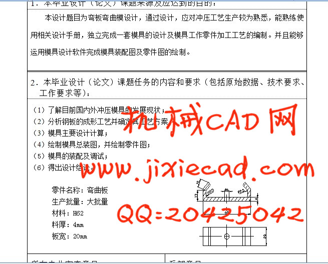 本设计运用了冲裁工艺及模具设计的基础知识。首先,分析了板材的性能要求,为选去模具的类型做了准备,同时,也为凸,凹模的材料有了依据。后分析弯曲件件的特征,确定了模具设计参数,选择其他零件及卸料装置。也为凸,凹模尺寸的计算有了根据。还有零件的加工工艺。