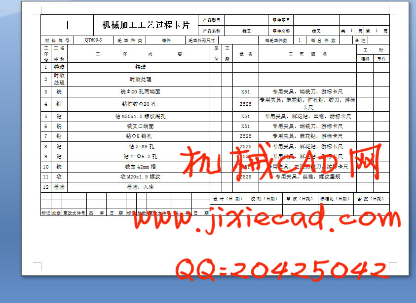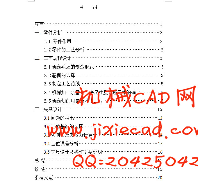 拨叉加工工艺规程及其铣槽的夹具设计是包括零件加工的工艺设计、工序设计以及专用夹具的设计三部分。在工艺设计中要首先对零件进行分析,了解零件的工艺再设计出毛坯的结构,并选择好零件的加工基准,设计出零件的工艺路线;接着对零件各个工步的工序进行尺寸计算,关键是决定出各个工序的工艺装备及切削用量;然后进行专用夹具的设计,选择设计出夹具的各个组成部件,如定位元件、夹紧元件、引导元件、夹具体与机床的连接部件以及其它部件;计算出夹具定位时产生的定位误差,分析夹具结构的合理性与不足之处,并在以后设计中注意改进。