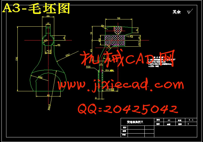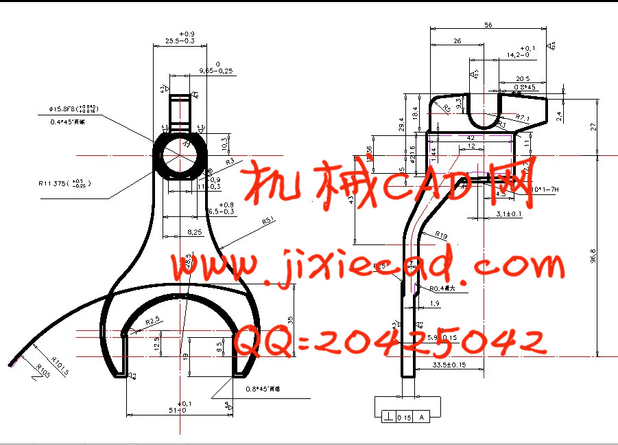 3、换档叉底面、下U型口两端面与孔Φ15.8中心线的垂直度误差为0.15mm。
