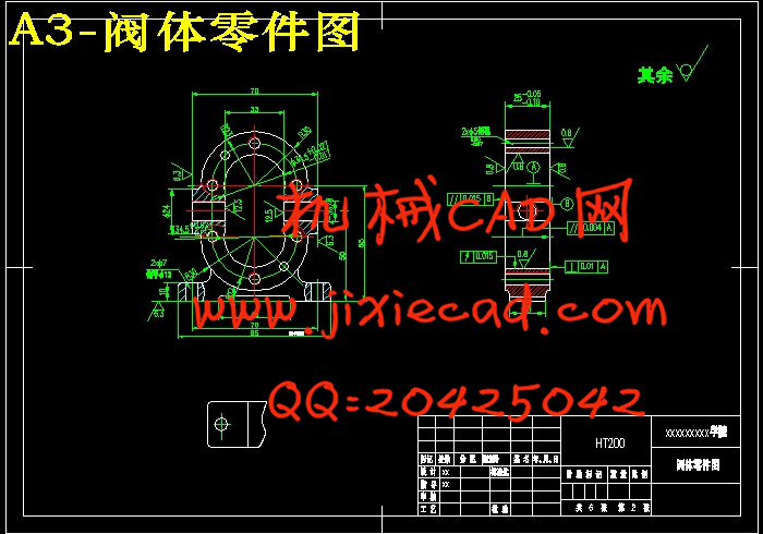 阀体加工工艺规程及其钻孔的夹具设计是包括零件加工的工艺设计、工序设计以及专用夹具的设计三部分。在工艺设计中要首先对零件进行分析,了解零件的工艺再设计出毛坯的结构,并选择好零件的加工基准,设计出零件的工艺路线;接着对零件各个工步的工序进行尺寸计算,关键是决定出各个工序的工艺装备及切削用量;然后进行专用夹具的设计,选择设计出夹具的各个组成部件,如定位元件、夹紧元件、引导元件、夹具体与机床的连接部件以及其它部件;计算出夹具定位时产生的定位误差,分析夹具结构的合理性与不足之处,并在以后设计中注意改进。