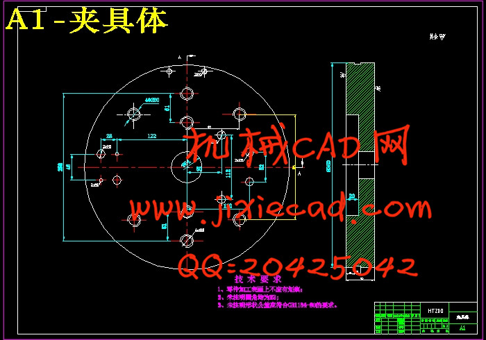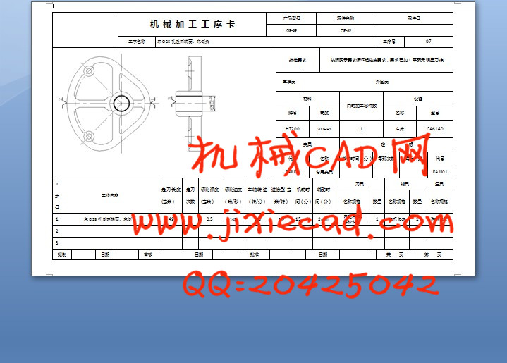 QF-69零件加工工艺及夹具设计是包括零件加工的工艺设计、工序设计以及专用夹具的设计三部分。在工艺设计中要首先对零件进行分析,了解零件的工艺再设计出毛坯的结构,并选择好零件的加工基准,设计出零件的工艺路线;接着对零件各个工步的工序进行尺寸计算,关键是决定出各个工序的工艺装备及切削用量;然后进行专用夹具的设计,选择设计出夹具的各个组成部件,如定位元件、夹紧元件、引导元件、夹具体与机床的连接部件以及其它部件;计算出夹具定位时产生的定位误差,分析夹具结构的合理性与不足之处,并在以后设计中注意改进。关键词:工艺,工序,切削用量,夹紧,定位,误差