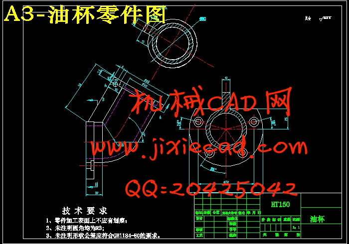 油杯零件加工工艺及夹具设计是包括零件加工的工艺设计、工序设计以及专用夹具的设计三部分。在工艺设计中要首先对零件进行分析,了解零件的工艺再设计出毛坯的结构,并选择好零件的加工基准,设计出零件的工艺路线;接着对零件各个工步的工序进行尺寸计算,关键是决定出各个工序的工艺装备及切削用量;然后进行专用夹具的设计,选择设计出夹具的各个组成部件,如定位元件、夹紧元件、引导元件、夹具体与机床的连接部件以及其它部件;计算出夹具定位时产生的定位误差,分析夹具结构的合理性与不足之处,并在以后设计中注意改进。关键词:工艺,工序,切削用量,夹紧,定位,误差