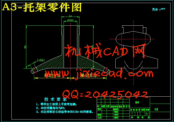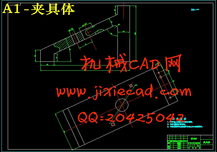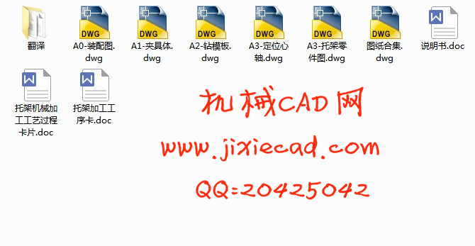 此次设计是对托架零件的加工工艺和夹具设计,其零件为铸件,具有体积小,零件复杂的特点,由于面比孔易加工,在制定工艺规程时,就先加工面,再以面为基准来加工其它,其中各工序夹具都采用专用夹具,特别的对于孔、槽和钻小孔斜面小孔的工序中,选一面两销的定位方式,并以操作简单的手动夹紧方式夹紧,其机构设计简单,方便且能满足要求。关键词 托架,加工工艺,专用夹具,设计