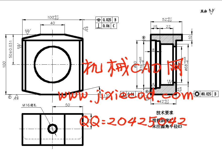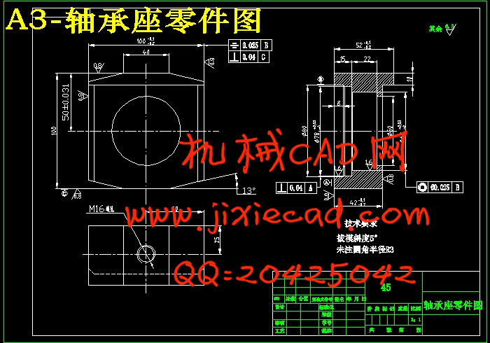 轴承座零件加工工艺及镗孔夹具设计是包括零件加工的工艺设计、工序设计以及专用夹具的设计三部分。在工艺设计中要首先对零件进行分析,了解零件的工艺再设计出毛坯的结构,并选择好零件的加工基准,设计出零件的工艺路线;接着对零件各个工步的工序进行尺寸计算,关键是决定出各个工序的工艺装备及切削用量。关键词:工艺,工序,切削用量
