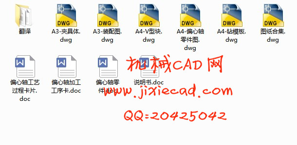 本设计是基于偏心轴零件的加工工艺规程及一些工序的专用夹具设计。偏心轴零件的主要加工表面是外圆及孔系。一般来说,保证平面的加工精度要比保证孔系的加工精度容易。因此,本设计遵循先面后槽的原则。并将孔与平面的加工明确划分成粗加工和精加工阶段以保证孔系加工精度。主要加工工序安排是先以支承孔系定位加工出顶平面,在后续工序中除个别工序外均用顶平面和工艺孔定位加工其他孔系与平面。夹具选用专用夹具,夹紧方式多选用手动夹紧,夹紧可靠,机构可以不必自锁。因此生产效率较高。适用于大批量、流水线上加工。能够满足设计要求。