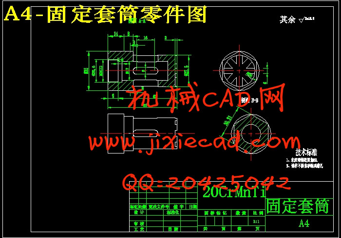 固定套筒零件加工工艺及钻床夹具设计是包括零件加工的工艺设计、工序设计以及专用夹具的设计三部分。在工艺设计中要首先对零件进行分析,了解零件的工艺再设计出毛坯的结构,并选择好零件的加工基准,设计出零件的工艺路线;接着对零件各个工步的工序进行尺寸计算,关键是决定出各个工序的工艺装备及切削用量;然后进行专用夹具的设计,选择设计出夹具的各个组成部件,如定位元件、夹紧元件、引导元件、夹具体与机床的连接部件以及其它部件;计算出夹具定位时产生的定位误差,分析夹具结构的合理性与不足之处,并在以后设计中注意改进。