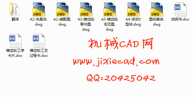 本设计是基于锥齿轮零件的加工工艺规程及一些工序的专用夹具设计。锥齿轮零件的主要加工表面是外圆及孔系。一般来说,保证平面的加工精度要比保证孔系的加工精度容易。因此,本设计遵循先面后孔的原则。并将孔与平面的加工明确划分成粗加工和精加工阶段以保证孔系加工精度。主要加工工序安排是先以支承孔系定位加工出顶平面,在后续工序中除个别工序外均用顶平面和工艺孔定位加工其他孔系与平面。夹具选用专用夹具,夹紧方式多选用手动夹紧,夹紧可靠,机构可以不必自锁。因此生产效率较高。适用于大批量、流水线上加工。能够满足设计要求。