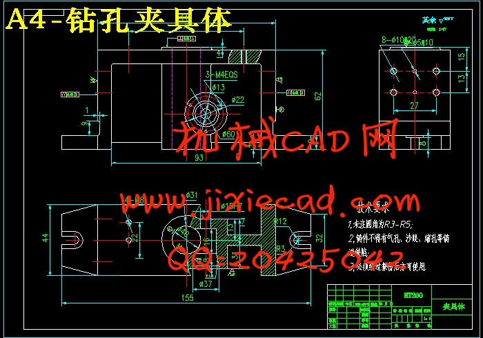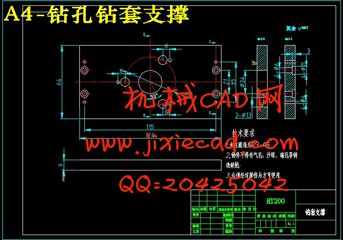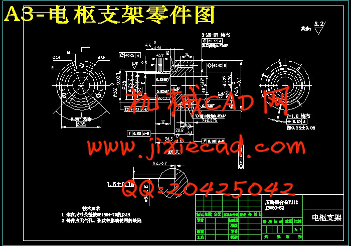 某型电机电枢支架零件加工工艺及钻床夹具设计是包括零件加工的工艺设计、工序设计以及专用夹具的设计三部分。在工艺设计中要首先对零件进行分析,了解零件的工艺再设计出毛坯的结构,并选择好零件的加工基准,设计出零件的工艺路线;接着对零件各个工步的工序进行尺寸计算,关键是决定出各个工序的工艺装备及切削用量;然后进行专用夹具的设计,选择设计出夹具的各个组成部件,如定位元件、夹紧元件、引导元件、夹具体与机床的连接部件以及其它部件;计算出夹具定位时产生的定位误差,分析夹具结构的合理性与不足之处,并在以后设计中注意改进。关键词:工艺,工序,切削用量,夹紧,定位,误差
