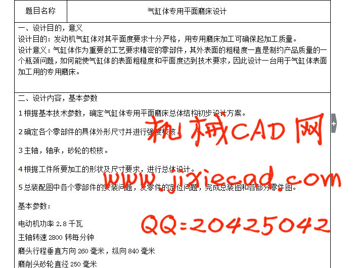 设计意义:气缸体作为重要的工艺要求精密的零部件,其外表面的粗糙度一直是制约产品质量的一个瓶颈问题,如何能使气缸体的表面粗糙度和平面度达到技术要求,因此设计一台用于气缸体表面加工用的专用磨床。