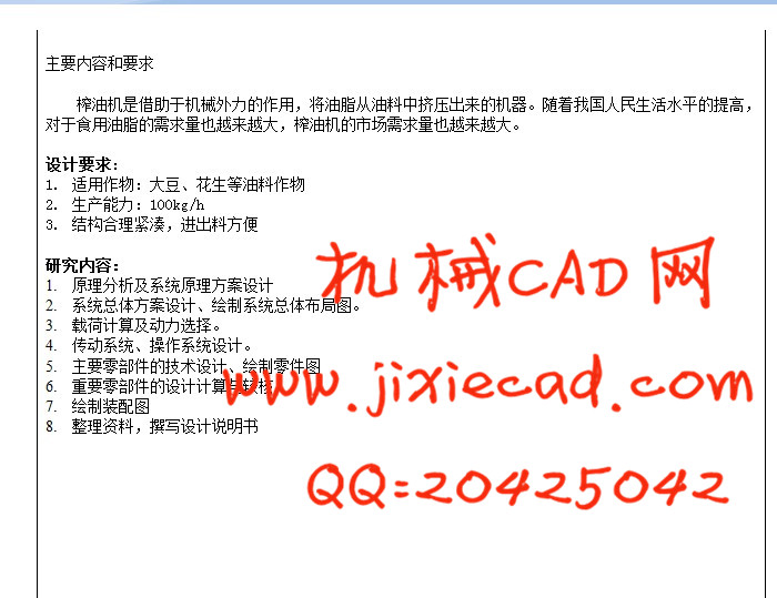 摘 要:本设计主要是对螺旋榨油机的总体结构设计。其中包括压榨部分,传动部分,机架部分,出油装置及进料等的结构设计。包括对输入端电动机功率/转速的选择。带及带轮的选择及设计。变速箱中齿轮的设计,轴的设计,轴承、键、联轴器的选择及相关的计算、校核。榨螺榨笼的设计等。其中榨螺和榨笼是榨油机的主要工作部件。本机适用于榨取大豆、花生等油料作物。