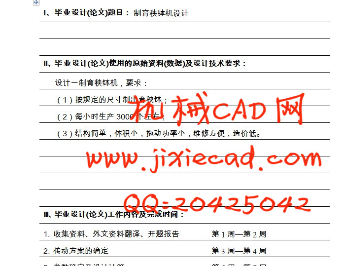 摘要:老式制育秧钵机由蜂窝煤成型机改进得来,体积庞大,结构复杂,成本高,效率低。本设计从老式制育秧钵机出发,在传动系统和执行机构上都做了很大的改进。本机每小时能生产3000个钵体,可广泛应用于玉米、蔬菜、瓜果等秧苗的制钵。该机采用单相电动机做动力源,可在广大的农村使用,不用担心需要较高的动力电压的问题。文中较详细的设计了制育秧钵机的传动系统和执行机构,对各个零件做了具体的结构尺寸设计,并对受载荷较大的零件进行了精确的校核。包括齿轮、带轮、轴和轴承等零部件的校核。该机的设计大量运用标准件,大大缩短了设计工作量和降低了生产制造周期及成本。主要设计内容有:方案的确定;电机的选择;各轴的转速、功率和转矩计算;带、齿轮、及锥齿轮的设计与计算;轴的最小直径;带、齿轮、及锥齿轮的尺寸计算以及方案图、装配图和零件图的绘制。