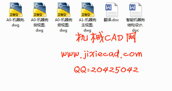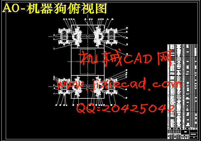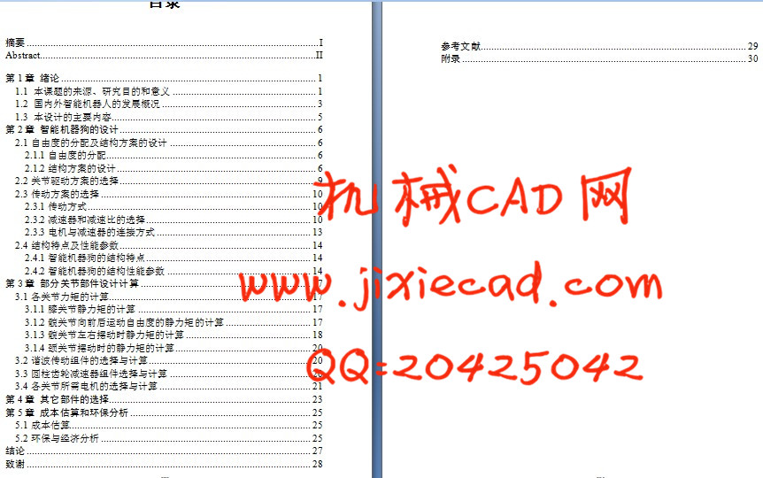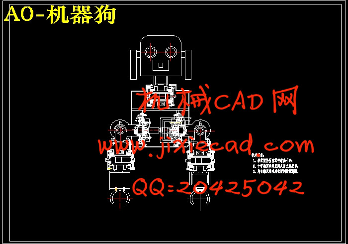 本设计采用关节型结构,成功地设计了智能机器狗的本体结构。本机器狗具有前后行、平地侧行等基本行走功能。另外机器狗头部还装有CD摄影机,胸腔内部可装备内置电源和智能设备。本设计参考了狗的结构组成,使得机器狗结构尽量与狗的本体结构相似,尤其在长度配比方面。本设计的结构比较复杂,关节数目众多,为了力求优化设计,设计者兼顾了关键部件的互换性和结构紧凑的原则。所有的关节都用了2036型的直流伺服电机作为驱动源,充分利用伺服电机的特性。伺服电机的驱动都采用了谐波减速器机构,该减速方案减速比大、效率高,是比较理想的减速方案。
