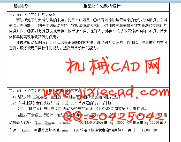 本次设计的题目是重型车辆车桥设计。驱动桥一般由主减速器、差速器、半轴及桥壳四部分组成,其基本功用是增大由传动轴或直接由变速器传来的转矩,将转矩分配给左、右车轮,并使左、右驱动车轮具有汽车行驶运动学所要求的差速功能;此外,还要承受作用于路面和车架或车厢之间的铅垂力、纵向力和横向力。