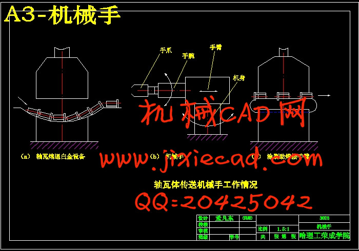 轴瓦体机械手是模仿人的手部动作,按给定程序、轨迹和要求实现自动抓取、搬运和操作的自动装置。它特别是在高温、高压、多粉尘、易燃、易爆、放射性等恶劣环境中,以及笨重、单调、频繁的操作中代替人作业,因此获得日益广泛的应用。机械手一般由执行机构、驱动系统、控制系统及检测装置三大部分组成,智能机械手还具有感觉系统和智能系统。本篇介绍的工业机械手属圆柱坐标式、全液压驱动机械手。本篇根据液压系统设计的一般程序,分四步详细地介绍了工业机械手液压系统设计过程,其中第3步拟定液压系统原理图是重点。