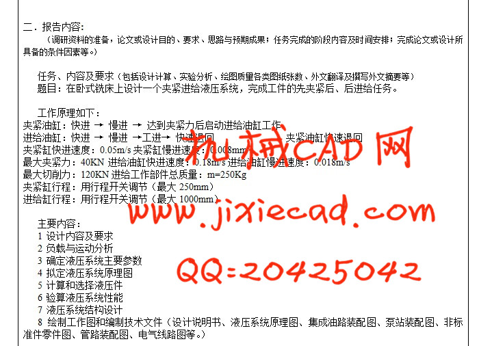 Along with the rapid development of machinery manufacturing industry, manufacturing equipment improvement is particularly important, especially metal cutting equipment is an important factor to improve productivity. Special milling hydraulic system design, besides contented in action and the main performance requirements, still must accord with small volume, light weight, low cost, high efficiency and reliable work, simple structure, convenient maintenance and use of universal design principles, some recognized. Milling hydraulic system design is mainly based on the condition, known to determine the work plan, hydraulic pump and hydraulic pressure, flow and other components of the design. Through the modification of special machine realization of hydraulic clamping and hydraulic pressure feed in the production process to reduce cost, stable and reliable, easy to achieve work overload protection, etc.Keywords modern mechanical ,hydraulic drive system, hydraulic clamping, hydraulic feeding目 录