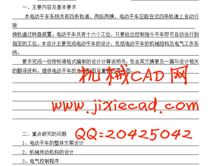 关键词:电动平车,传动机构,电动转盘,设计计算,控制系统设计。