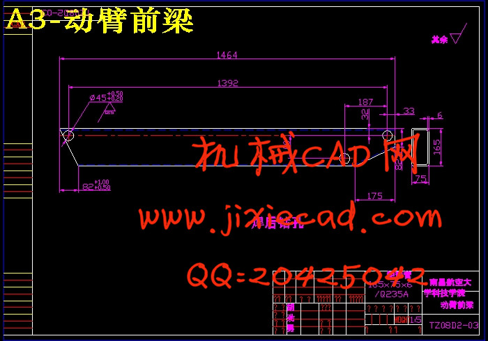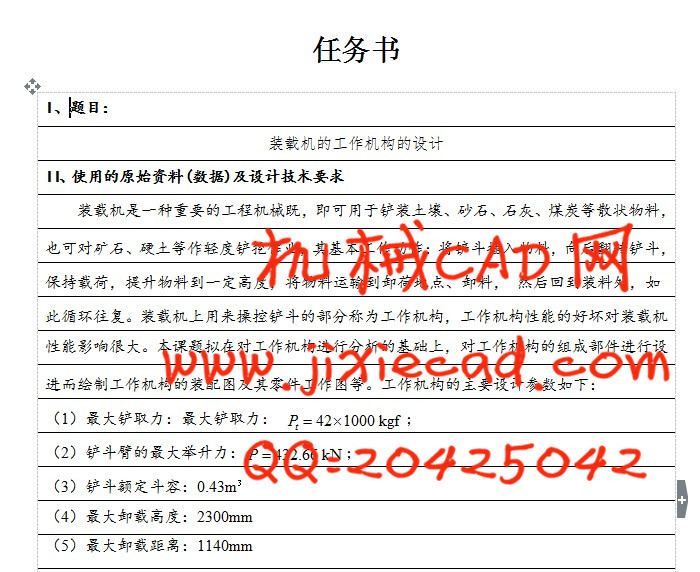 The TZ08 D Front Wheel loader is the fourth generation small scaled Wheel loader in the Modern Agricultural Equipment Engineering Technique Company of Shandong Agricultural Machinery Research Institute. It is one machine extensively used for highway, railroad, construct, water electricity, port, mineral mountain etc and mainly used for a spade to pack soil, freestone, lime, coal...etc. to spread a form material.It can also make a light degree spade to dig homework to the mineral stone, hard soil etc.The abroad loader develop quickly, but our loaders exist a lot of problems on the design, among them mainly concentrating on designing strength in the credibility, structure etc.With the TZ08 D wheel loader for a example, this text firstly introduce its structure and give preliminary designing with the help of AUTOCAD2007 , then asking for help of Pro/E software to carry on loading machine work device of 3D entity design for really reflecting loading machine of several the shape then reflects their position of each parts effectively and introduce its instruction to resolve a problem in time. Finally, the text checks for the strength of the boom structure in the loader with the help of beam mold in the Mechanics of Materials