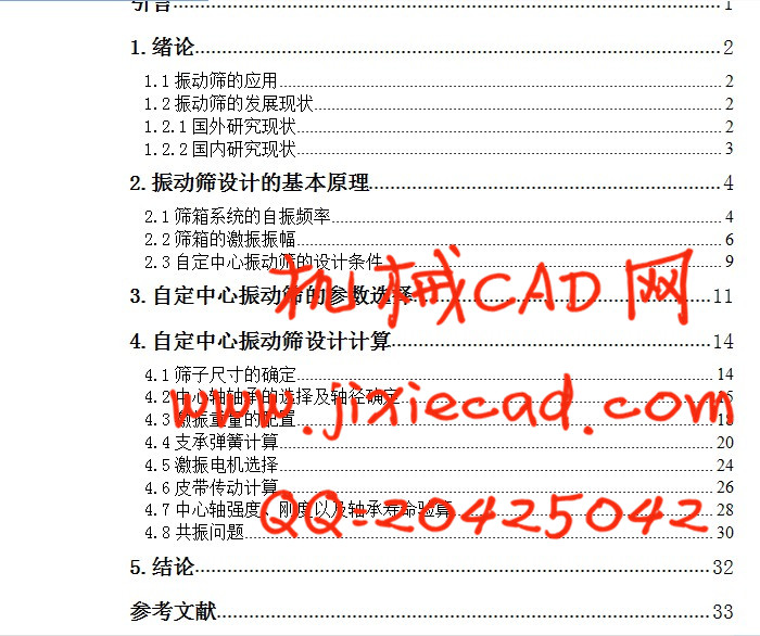 摘要:目前我国各种选煤厂使用的设备中,振动筛是问题较多、维修量较大的设备之一。这些问题突出表现在筛箱断梁、裂帮,稀油润滑的箱式振动器漏油、齿轮打齿、轴承温升过高、噪声大等问题,同时伴有传动带跳带断带等故障。这类问题直接影响了振动筛的使用寿命,严重影响了生产。自定中心振动筛可以很好的解决此类问题,因此本次设计的振动筛为自定中心振动筛,该系列振动筛主要用于煤炭行业中物料分级、脱水、脱泥、脱介等作业。其工作可靠,筛分效率高,但设备自身较重。设计分析论述了设计方案,包括振动筛的分类与特点和设计方案的确定;对物料的运动分析,对振动筛的动力学分析及动力学参数的计算,合理设计振动筛的结构尺寸;进行了激振器的偏心块等设计与计算,包括原始的设计参数,电动机的设计与校核;进行了主要零部件的设计与计算,皮带的设计计算与校核,弹簧的设计计算,轴的强度计算,轴承的选择与计算,然后进行了设备维修、安装、润滑及密封的设计,最后进行了振动筛的环保以及经济分析。