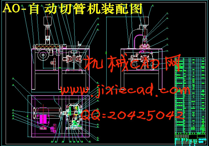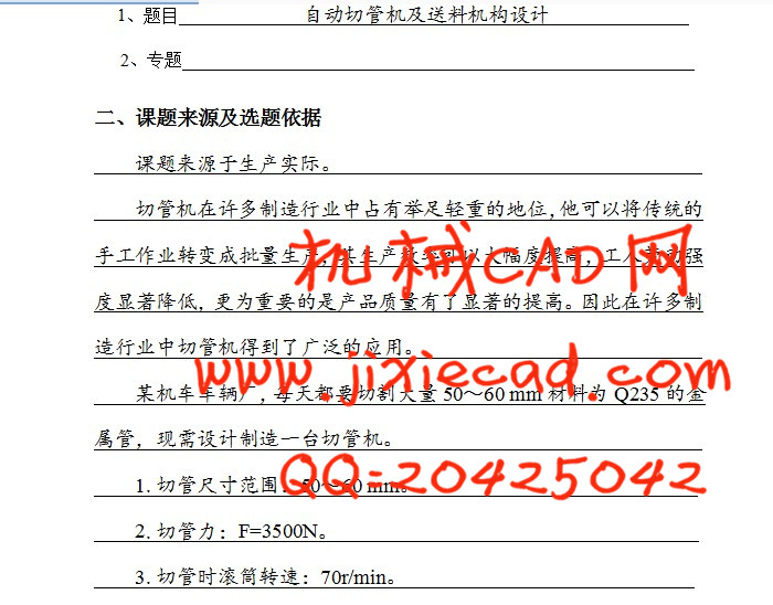 Automatic cutting machine mainly being used in processing various functional tube parts ,primarily includes varieties material`s metals tube parts . This time the designed automatic cutting machine and conveying mechanism essentially process the tube parts which diameter between 60~70mm.The task of this time designed automatic cutting machine and conveying mechanism , automatic pipe cutting and feeding mechanism to achieve automatic processing of metal pipe fitting objective. The main work is the automatic pipe cutting bevel gear machine reducer, pipe cutting machine roller, frame and the automatic feeding programme of work organization design. Among them, pipe cutting machine working principle is: the motor through driving V, bevel gear reducer, gear transmission to a pair of roller, and then drive the metal tube rotary, obtain the main movement during cutting. At the same time, move down the disc blade, cutting the pipe. Including the determination of design and calculation formulation, transmission pipe cutting machine design scheme (including the choice of motor, the proposed transmission scheme, the shaft speed, power and torque calculation of the transmission mechanism, design and calculation.).According to the already experienced--formula,the mutual dimension among each components being fixed .Finally ,draw the assemble chart; components chart as well as portion spare parts chart.