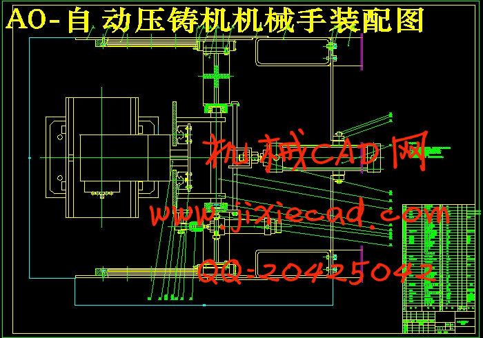 本设计中的自动压铸机主要是用于铝制胚件的压铸,主要是把两个配料放入模具,对毛胚件用感应炉进行加热熔化连接成为一体。主要组成部件:一个带有二独立的单独驱动的机械手,带有平台或抓爪的自动卸件装置,冲模净化用人工操作的清除设备,石墨粉浴浸浴室由不锈钢用分开的浴槽与搅拌器组成熔炉,双波道感应电炉用3感应器。自动压铸机的顶部回转部分主要是采用蜗轮蜗杆减速和电磁离合器实现双机械手的独立控制。设备控制用自由可编程松下FP1系列的可编程控制器控制,用可控硅整流器进行无级的控制窑炉。