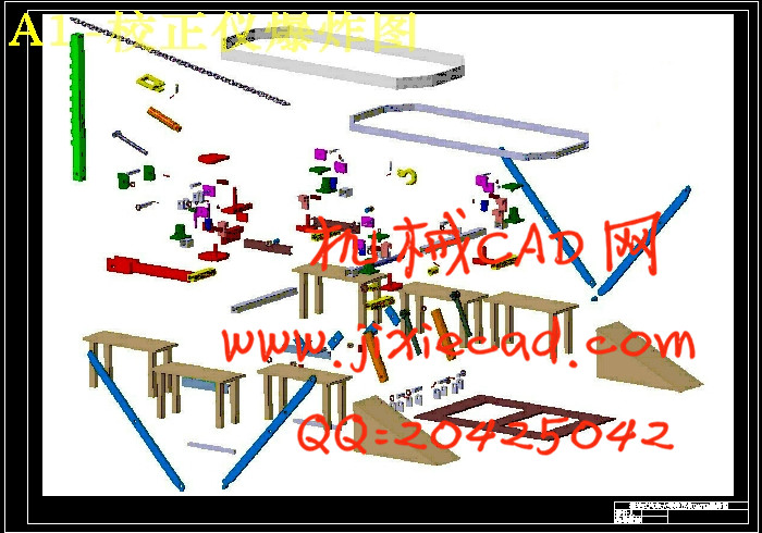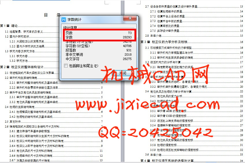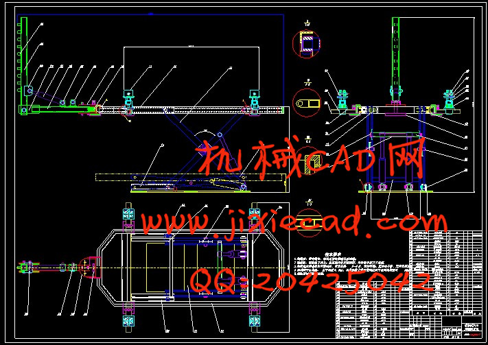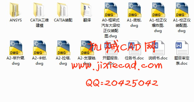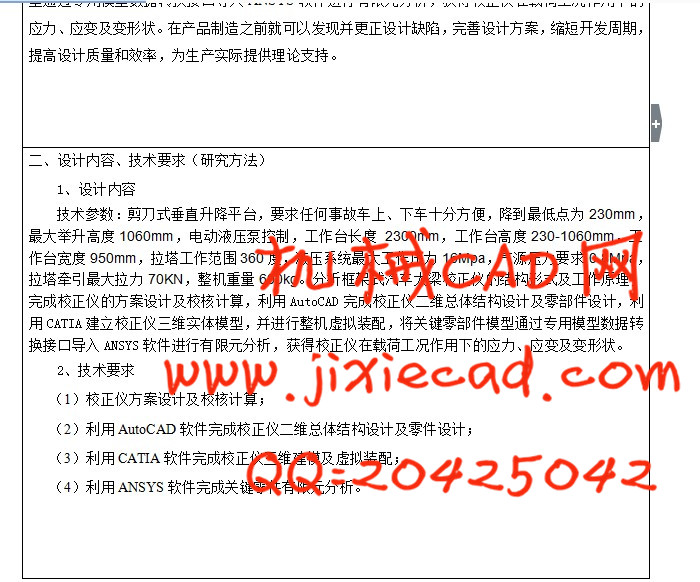 技术参数:剪刀式垂直升降平台,要求任何事故车上、下车十分方便,降到最低点为230mm,最大举升高度1060mm,电动液压泵控制,工作台长度 2300mm,工作台高度230-1060mm,工作台宽度950mm,拉塔工作范围360度,液压系统最大工作压力16Mpa,气源压力要求0.8Mpa, 拉塔牵引最大拉力70KN,整机重量600kg。分析框架式汽车大梁校正仪的结构形式及工作原理,完成校正仪的方案设计及校核计算,利用AutoCAD完成校正仪二维总体结构设计及零部件设计,利用CATIA建立校正仪三维实体模型,并进行整机虚拟装配,将关键零部件模型通过专用模型数据转换接口导入ANSYS软件进行有限元分析,获得校正仪在载荷工况作用下的应力、应变及变形状。