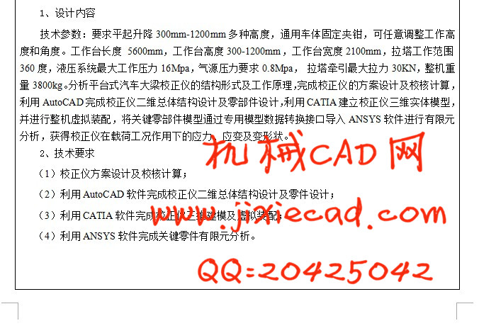 目 录车身校正是通过一定的外力将因事故损坏或疲劳损坏的部位修复到车辆出场时技术标准"状态“的过程。汽车在人们的日常生活中起着不可或缺的作用,当然有使用就会有损坏,而且损坏的情况也越来越严重,从而一些专门的修复工具也随之产生—平台式汽车车身校正设备。目前,国内普遍采用的车身校正设备主要有框架式和平台式,其中平台式较多。这种设备较为先进,国内外制造的设备一般都采用这种形式,是国际间比较流行的一种车身校正设备。平台式车身校正设备主要包括有举升支架,工作台,加力塔及其连接机构。本设计的目的旨在对平台式汽车大梁校正仪的二维设计及三维虚拟设计进行探索和实践,为校正仪的设计提供参考。