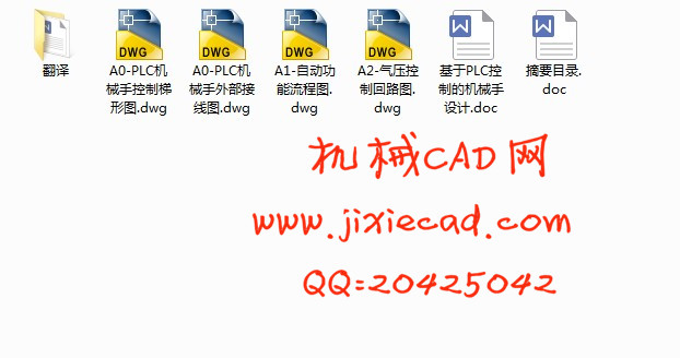 气动机械手是能模仿人手和臂的某些动作功能,用以按固定程序抓取、搬运物件或操作工具的自动操作装置。它可代替人的繁重劳动以实现生产的机械化和自动化,能在有害环境下操作以保护人身安全,因而广泛应用于机械制造、冶金、电子、轻工和原子能等部门。本设计机械手主要用于物料的运输。机械手是一种能自动化定位控制并可重新编程序以变动的多功能机器,本设计介绍的是机械手模型基于PLC的控制系统设计。气动机械手控制系统的设计要求是在控制系统的指令下,能将工件迅速、灵活、准确、可靠地抓起并运送到指定位置,因此本设计采用PLC可编程控制器作为工件抓取机械手的控制系统,首先根据机械手的动作流程和输入输出要求选择了PLC的型号,然后根据机械手功能和特性对各原件进行了选型并对其进行了计算与校和,之后对机械手手爪进行了设计并对其进行计算与校和,在此基础上对电气回路进行了设计,最后对控制系统硬件及编辑原件进行了选择,同时确定I/O接口,进行程序的编辑与调试,从而使机械手完成最后的装夹任务。
