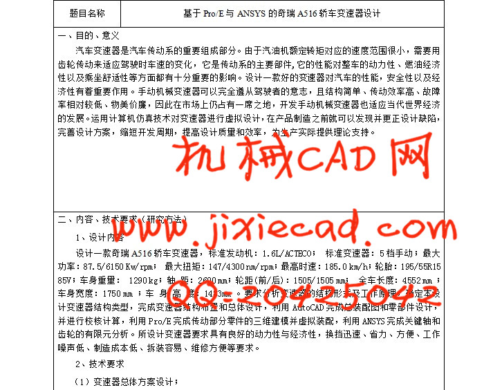 To change the engine used to spread transmission of torque and wheel speed, in order to make car travel at different speeds, transmission should be a number of stalls, including neutral and reverse. Mechanical transmission is a traditional manual transmission car, because of its simple structure, small size, low manufacturing cost, ease of assembly and repair, high transmission efficiency, are still in use. Transmission mechanism as an impotant component, the design of transmission line with the goal of reunification, it is simple and convenient. Transmission performance of the vehicle directly reflects the level of performance, especially fuel economy is good or bad. Therefore, the design of transmission quality has been the focus of competition in the automotive industry.The design for the two-axis mechanical transmission cars. Form the basis of passenger cars, Tread, wheelbase, minimum ground clearance, minimum turning radius, vehicle weight, loaded weight and parameters such as maximum speed, combined with the suitable selection of the cars engine engine models can be drawn maximum power, maximum torque, displacement and other important parameters. Combination of some basic parameters of passenger cars, to choose the appropriate reduction ratio of the Lord. Based on the above parameters to calculate the transmission of the relevant parameters for a reasonable design.