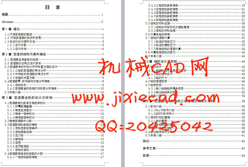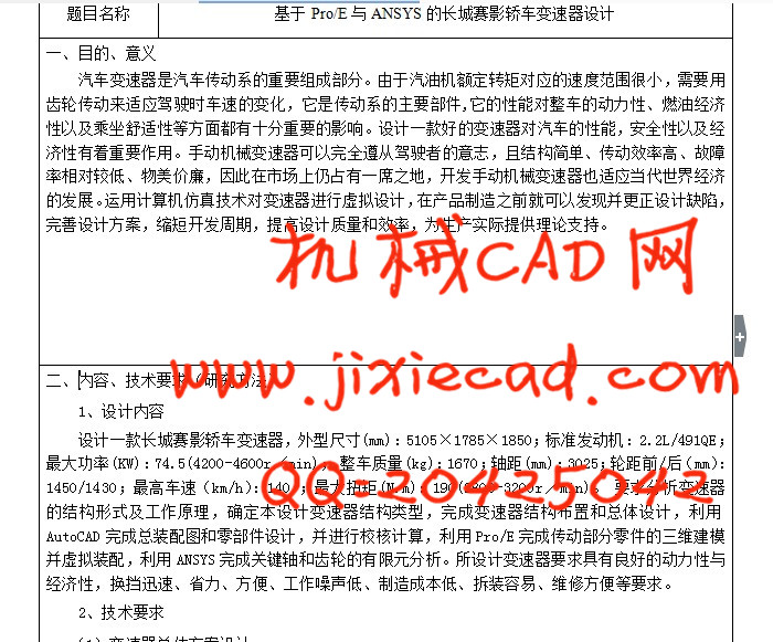 Notebook design from the overall scheme of the drive transmission of transmission system began, analysis, gear scheme decorate a form of research and analysis, the transmission of basic parameters selection, parts structure project analysis to identify, synchronizer, manipulate the institutions and cabinet design to choose. According to the selection of vehicles, a combination of these parameters, combined with car design, automobile theory, mechanical design and related knowledge, compute related transmission parameters and demonstrates the rationality of the design. And then use Auto CAD software draw the transmission, and the assembly and parts graph Pro/E software ANSYS software, 3d modeling, use of key parts, using three-dimensional finite element analysis of the reliability of the design of the platform improve this.