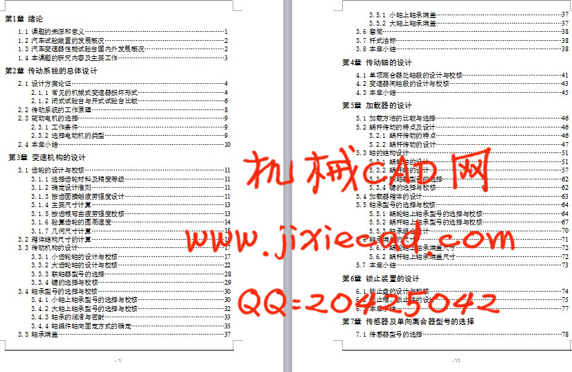 This text expounded in the transmission’s structure of layout and the working principle, I have a detailed transmit agencies design on the base of the design programme’s determined,then I analysis the design’s reasonable and check the mechanical stiffness and strength,makes this test bench to complete such as the transmission efficiency testing, running-testing, gear wearing testing, and in accordance with the detailed design parameters of various parts, using a pilot mapping software AUTOCAD map the transmit agencies’ assembly and some parts of the it.