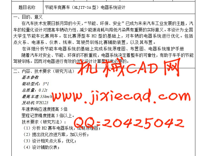 This article describes the energy-saving car race car (HLJIT-3A type) electrical system design into efficient car odometer ignition system design and improvement of two parts. Among them, the odometer designed to minimize the system microcontroller and Hall switch sensor at the core. Sensors into a different speed pulse signals of different frequencies to control the input to the microcontroller and calculation, and then used to display LCD module, making the race cars, the largest energy-saving vehicles, average speed, instantaneous speed, distance, laps, time and other auxiliary parameters can directly drive the display to the driver, to better and effective, and reliable help the driver to finish the game.Improvement of the ignition system sucked the original CDI ignition (capacitive discharge ignition) improved to automatically into the current ignition angle. Compared with the original CDI ignition, automatic ignition angle of the DC ignition energy larger, more stable, more accurate ignition timing, increasing the light stroke and exhaust stroke of the ignition trigger number, so that the mixture combustion engine and more energy is sufficient more fuel-efficient, complete combustion does not occur, carbon spark plug does not work and so on. And that the ignition wiring simple, easy installation, stable performance and less susceptible to external temperature and humidity, with automatic angle function, variable angle curve is good, adapt to engine speed condition and so on.