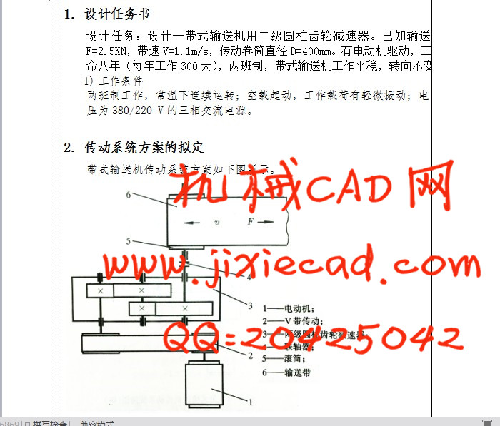 设计任务:设计一带式输送机用二级圆柱齿轮减速器。已知输送拉力F=2.5KN,带速V=1.1m/s,传动卷筒直径D=400mm。有电动机驱动,工作寿命八年(每年工作300天),两班制,带式输送机工作平稳,转向不变。
