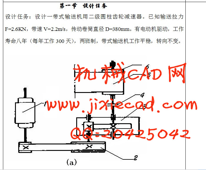 设计任务:设计一带式输送机用二级圆柱齿轮减速器。已知输送拉力F=2.6KN,带速V=2.2m/s,传动卷筒直径D=380mm。有电动机驱动,工作寿命八年(每年工作300天),两班制,带式输送机工作平稳,转向不变。