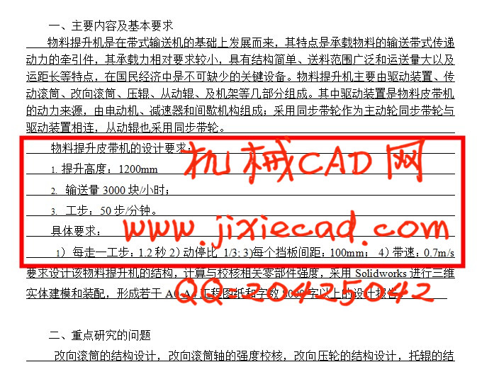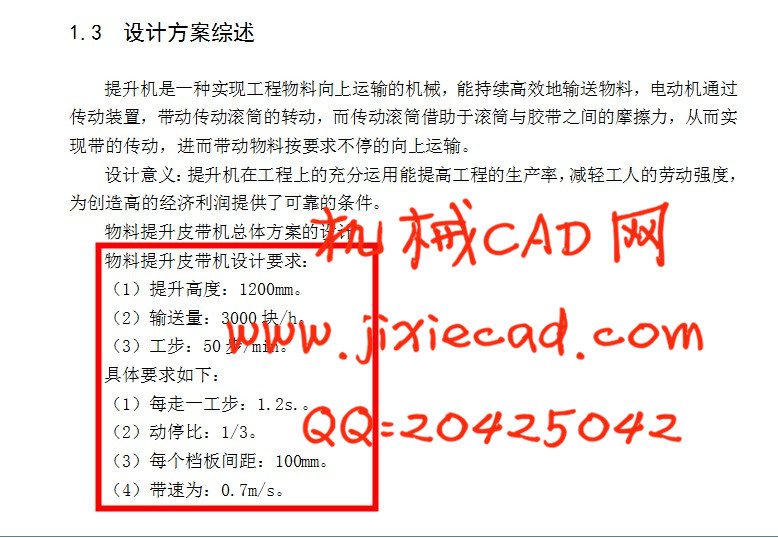 本文以食品加工业为背景,设计提升食品的机械。物料提升皮带机是在带式输送机的基础上发展起来的。物料提升皮带机与传统的带式输送机一样是以胶带、钢带、钢纤维带、塑料带和化纤带等作为传送物料和牵引工件的输送机械。其特点是承载物料的输送机也是传递动力的牵引件,这与其他输送机械有着显著的区别。本次设计的物料提升皮带机是一种小型的运输机械,其承载能力要求较小,相对于其他的带式输送机成本要求低,设计结构紧凑。