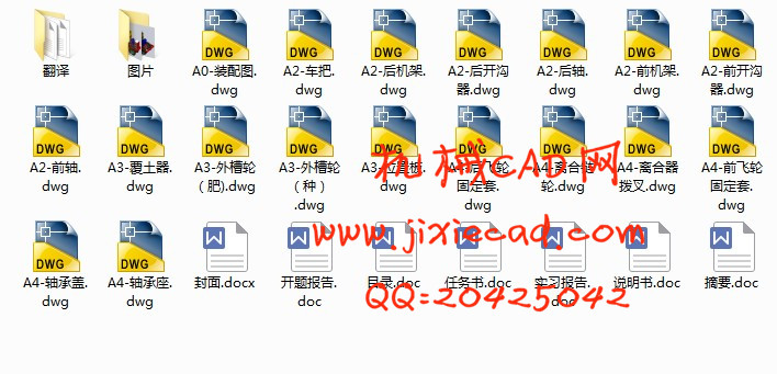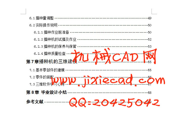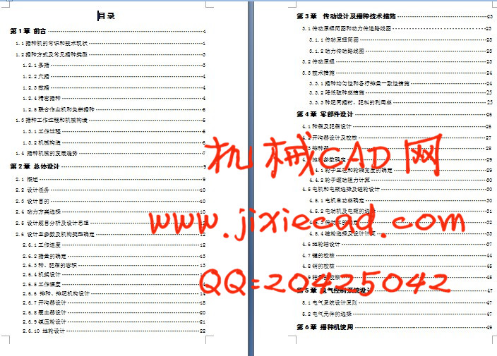 This design is applied mostly with the farms of the farmers ,they can also used to fertilize、abrade、get rid of grass and so on ,when we incress some equipment .My design introduce the structure of the seeding-machine and the types of many parts 、some request an fuction .My design introduce the drive equipment of the machine and the types of many parts 、request and fuction .My design also introduce the drive equipment of the machine and the request of the parts which consist of the selecting of the power 、the size 、the design of the axial 、chain wheel 、some other parts and so on .We must consider suiting well of the depth 、the row spacing 、the distance of scoop and the rate of seeds breaking up when seeding .In my design ,while thinking over applied ,I give attention to saving econmy ,consequently achieve structure in reason 、the cost of produce lowness 、the cost of power lowness 、the effidiency highness and convenient when operating .