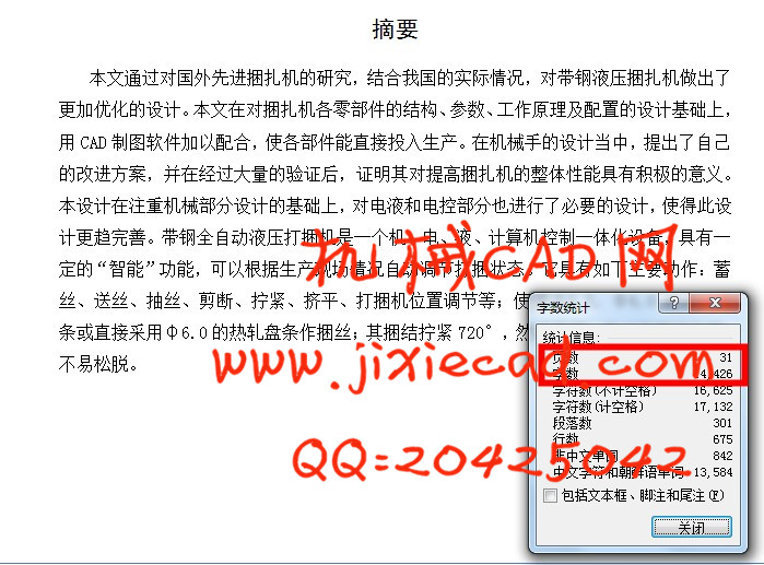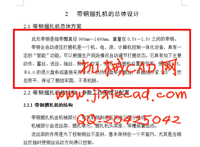 本文通过对国外先进捆扎机的研究,结合我国的实际情况,对带钢液压捆扎机做出了更加优化的设计。本文在对捆扎机各零部件的结构、参数、工作原理及配置的设计基础上,用CAD制图软件加以配合,使各部件能直接投入生产。在机械手的设计当中,提出了自己的改进方案,并在经过大量的验证后,证明其对提高捆扎机的整体性能具有积极的意义。本设计在注重机械部分设计的基础上,对电液和电控部分也进行了必要的设计,使得此设计更趋完善。带钢全自动液压打捆机是一个机、电、液、计算机控制一体化设备,具有一定的“智能”功能,可以根据生产现场情况自动调节打捆状态。它具有如下主要动作:蓄丝、送丝、抽丝、剪断、拧紧、挤平、打捆机位置调节等;使用φ6.5,φ6.0的退火盘条或直接采用φ6.0的热轧盘条作捆丝;其捆结拧紧720°,然后挤平,保证了捆结牢固,不易松脱。关键词:带钢;捆扎;液压;扭结