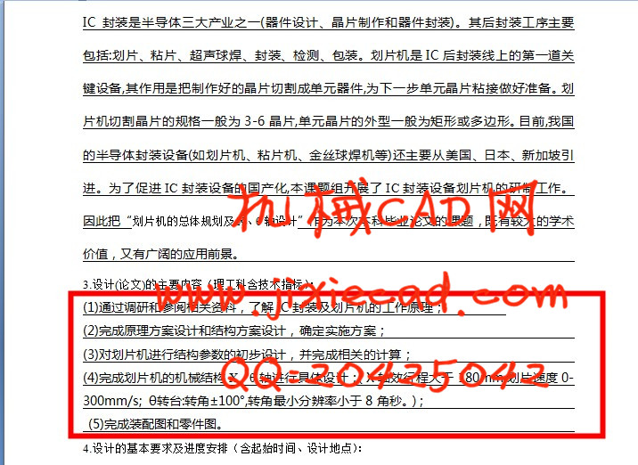 摘 要:IC封装是半导体三大产业之一,划片机是IC后封装线上的第一道关键设备,其作用是把制作好的晶片切割成单元器件,为下一步单元晶片粘接做好准备。划片机切割晶片的规格一般为3-6晶片,单元晶片的外型一般为矩形或多边形。目前,我国的半导体封装设备所用的划片机,还主要从美国、日本、新加坡引进。为了促进划片机的国产化,本课题组开展了IC封装设备划片机的研制工作。因此把“划片机的总体规划及X、θ轴设计”作为本次本科毕业论文的课题,既有较大的学术价值,又有广阔的应用前景。