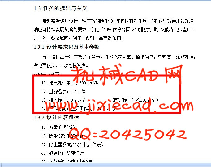 本设计针对冶炼的生产及场地等的具体情况,来设计布袋除尘器,并且使其排污情况达到国家相关的排放标准要求。而且,又要尽量满足投资少、运转费用低、操作方便、维护简单的要求。