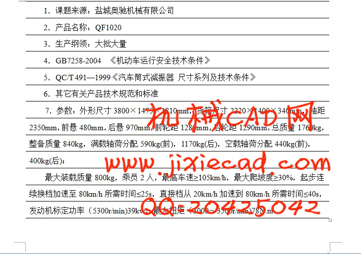 摘要:为了提高汽车行驶的平顺性和稳定性, 本课题进行了产品名称为QF1020货车前后悬架的设计。通过对课题内容的分析, 并结合相关设计手册,进行了方案设计与比较, 设计了麦弗逊前悬架, 钢板弹簧后悬架。在设计中,首先,分析了麦弗逊独立悬架的组成和功用;其次,进行悬架的上各零部件强度的校核;第三,详细考虑各部件之间的连接关系;最后在此基础上进行悬架自然振动频率,悬架静挠度和动挠度以及悬架弹性特性的计算。在分析麦弗逊悬架的组成和作用以及各零部件的尺寸确定的基础上,再利用CAD软件进行二维制图。此次的设计进行了准确的计算和详细的结构分析,为麦弗逊悬架的结构优化提供了依据,从而在运动学和动力学方面提高汽车的性能。