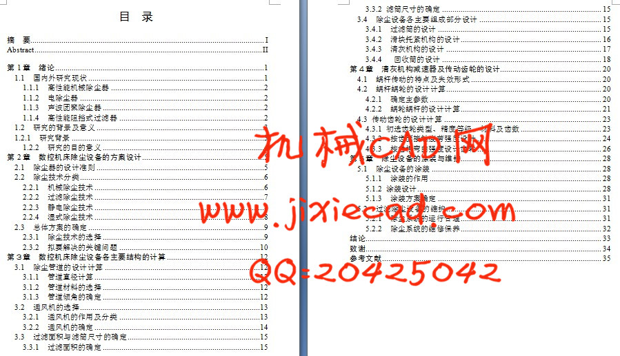Human need a pure air environment (including atmospheric environment and room air environment) during the production and life process, the dust removal technology has provided the technical method for the realization of the ideal air environment. Because dust removal equipment is needed in indoor job, so in the dust removal equipment scheme design should choose filter type removal technology. The main content of this article on the machine tool dust removal equipment dust removal pipelines, the ventilator, filter canister, the slider's tight institutions of major structure design calculation, all the turbine worm gear reducer ash institutions and transmission gears to carry on the design calculation and intensity of dust removal equipment, the coating and maintenance also puts forward specific solutions.key words:filtration dust removal technology;ventilator filter cylinder;dust cleaning mechanism;slide tighten mechanism