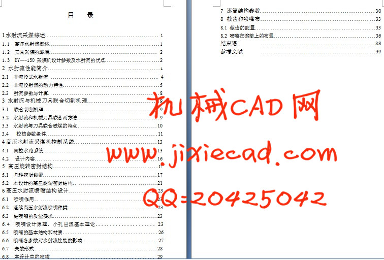 本毕业设计题目是水射流采煤机切割装置设计。主要阐述了高压水射流技术在采煤机上的应用之背景,优缺点和所需要解决的问题等方面的内容。