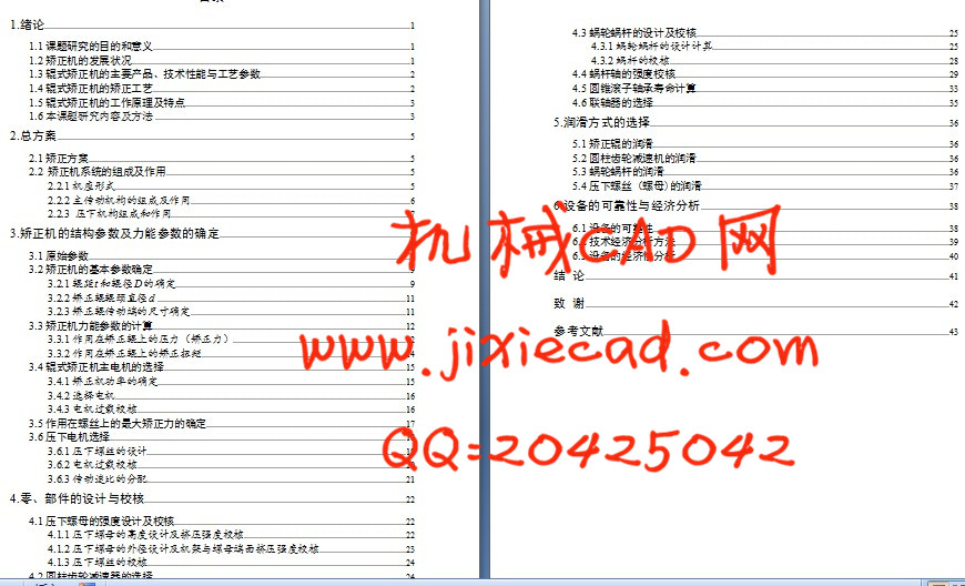With the continuous development of science and technology, China’s steel rolling production technology progress. Use of steel rolling production technology, improve the quality of rolled piece products, reduce rolling production time, improve yield and lower production cost and material utilization has become a mechanical design of the main goals of steel rolling. But the rolled piece in the process of rolling, cooling and transportation, due to the influence of various factors, often produce shape defect. Columns such as rail, steel and steel pipe often appear arc bending;Some steel shapes creates a flange section inside and outside, expansion and distortion; Plate and strip will produce longitudinal bending, lateral bending, edge wave shape and intermediate ladle and rocker. In order to eliminate these defects, the correction technology emerges as The Times require.According to the design the system of the nine roller plate straightening machine press. The structure of the main contents include: nine roller straightening machine, straightening machine can force parameters calculation, selection and calculation of main motor and motor under pressure and check, coupling and reducer design distribution, pressure of screw, nuts worm gear and worm under pressure design and checking calculation and the design of bearing and life.