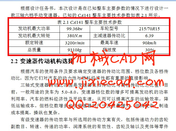 随着汽车工业的发展,车用变速器的设计趋势是增大其传递功率与重量之比,并要求其具有更小的尺寸和良好的性能。本设计在给定发动机输出转矩、转速及最高车速、最大爬坡度等条件下,着重对变速器齿轮的结构参数、轴的结构尺寸等进行设计计算;并对变速器的传动方案和结构形式进行设计;同时对操纵机构和同步器的结构进行设计;从而提高汽车的整体性能。关键词: 变速器 齿轮 轴 同步器
